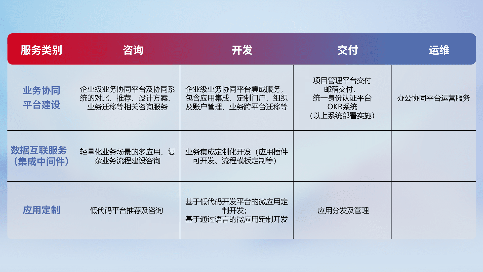 针对钉钉、、、企微、、IDaas等平台级产品提供产品的规划、、方案、、、、交付、、、定制化开发等服务,,,,实现如统一协同办公、、智能客户服务、、、混合会议管理、、、、智能数据查询、、、、等业务场景,,实现数字化转型。。。。