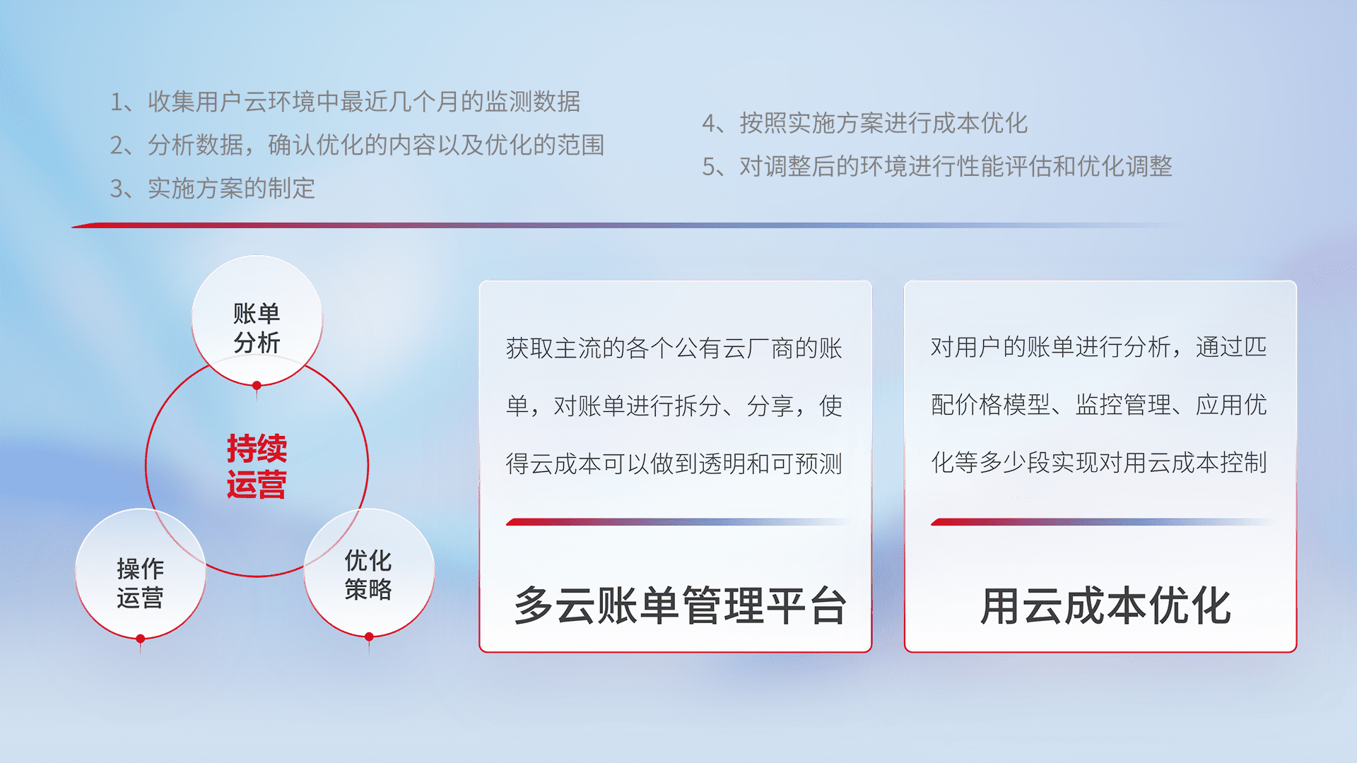 通过多云纳管,,,,以统一的资源数据模型把客户的云资源进行抽象和封装,,,,进而实现对多云资源的统一操作,,,保障云资源管理的可靠性、、、、稳定性与可用性。。。量身定制化运维内容,,,,配置、、、开发运维、、、补丁管理、、、备份、、、、监控、、认证和访问管理、、审计和日常巡检等,,保障在用云过程中的可靠度,,,稳定度以及高可用率。。。